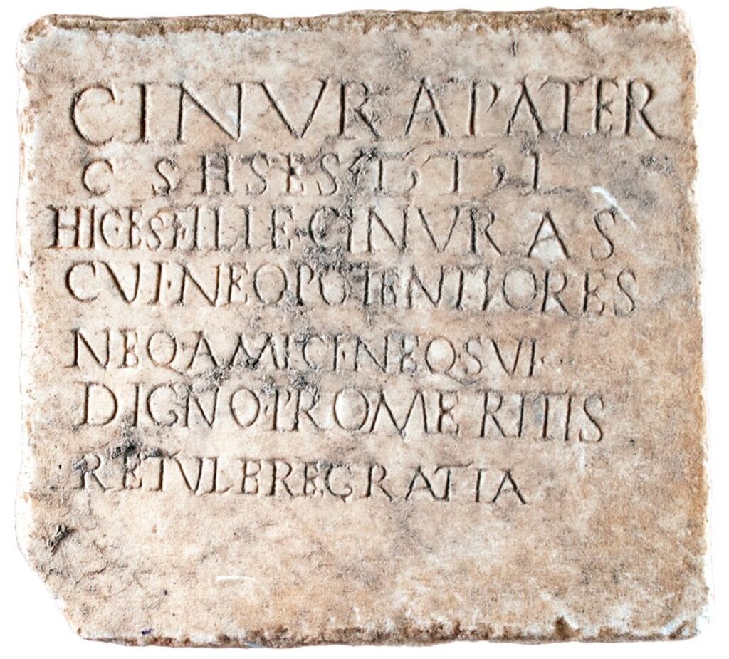 Recientemente, se han encontrado hasta 89 inscripciones de una antigua necrópolis fenicio-romana en Cádiz. Digamos que es un cementerio junto a una edificación, posiblemente de culto. Entre ellas, se ha encontrado la Cinuras, al parecer un liberto, padre resentido porque no recibió la gratitud que merecía.